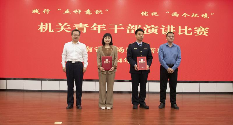 为庆祝“五四”青年节,促进机关青年干部融合交流,4月25日,河南省市场监管局举办践行“五种意识”、优化“两个环境”机关青年干部演讲比赛。党组书记、局长景劲松全程观赛并为一等奖选手颁奖。局领导班子成员、二级巡视员、省纪委监委驻局纪检监察组,机关各处室、直属分局、12315指挥中心负责同志和干部代表观看比赛。